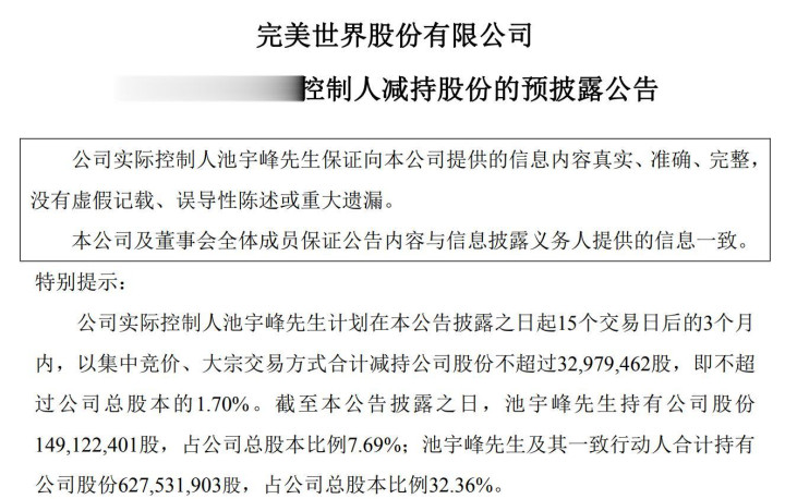 截至本公告披露之日,池宇峰持有完美世界股份149122401股,占总股本的7.69%;池宇峰及其一致行动人合计持有完美世界股份627531903股,占总股本的32.36%。