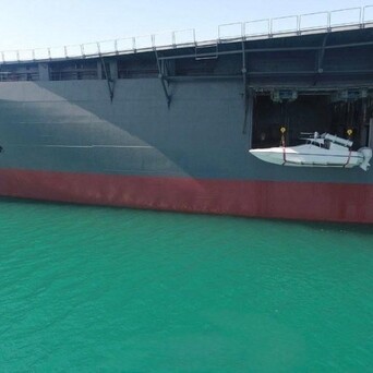 从视频和图片来看,这艘无人机航母相当巨大,堪称“海上基地舰”——它配备了滑跃起飞甲板,能起降各种型号的侦察和打击无人机,展示时,多架具备隐身能力的无人机就在准备起飞。同时,它也能起降直升机,船舱中还能携带高速攻击导弹艇。